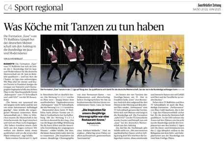 Riesenjubel dann beim TV Rußhütte beim dritten Turnier am 17. Mai in Großostheim bei Aschaffenburg. Mit der Wertung 3-1-2-1-2 reichte es diesmal für den Sieg. „Das war die längst überfällige Belohnung für die harte Arbeit und die tänzerische Entwicklung der vergangenen Monate“, erklärt Schillo. Die Idee, die hinter ihrem Stück steht, fasst sie so zusammen: „Die Inspiration für unsere diesjährige Choreographie war eine Restaurant-Szene – von Diskussionen und überschwänglichen Tischgesprächen bis hin zu konkurrierenden Köchen hinter verschlossenen Türen. Ganz im Sinne einer Küchen-Schlacht.“ Und sie ergänzt: „Dabei lag unser Fokus vor allem auf kreativem, gestenreichem Tanzmaterial.“