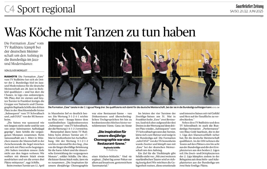 Rußhütte Die Formation „Ease“ vom TV Rußhütte hat sich als Dritter der 2. Bundesliga Süd im Jazz- und Moderndance für die deutsche Meisterschaft am 28. Juni in Bielefeld qualifiziert – und hat dort die Chance, in Liga eins aufzusteigen. Mit Platz drei im vierten und letzten Turnier in Frankfurt festigte die Gruppe von Trainerin und Choreographin Raphaela Schillo den dritten Platz in der Abschlusstabelle hinter „Subsequent“ vom TV Schwalbach und „subTANZ“ von der SG Sossenheim.
